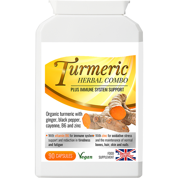 Each capsule combines organic turmeric powder PLUS high-potency turmeric extract (providing curcumin – the active ingredient) with ginger root, cayenne pepper, piperine (black pepper), zinc citrate and vitamin B6. The piperine has been included to potentiate the absorption and effect of the other herbal actives – a well-known herbalists’ combination.